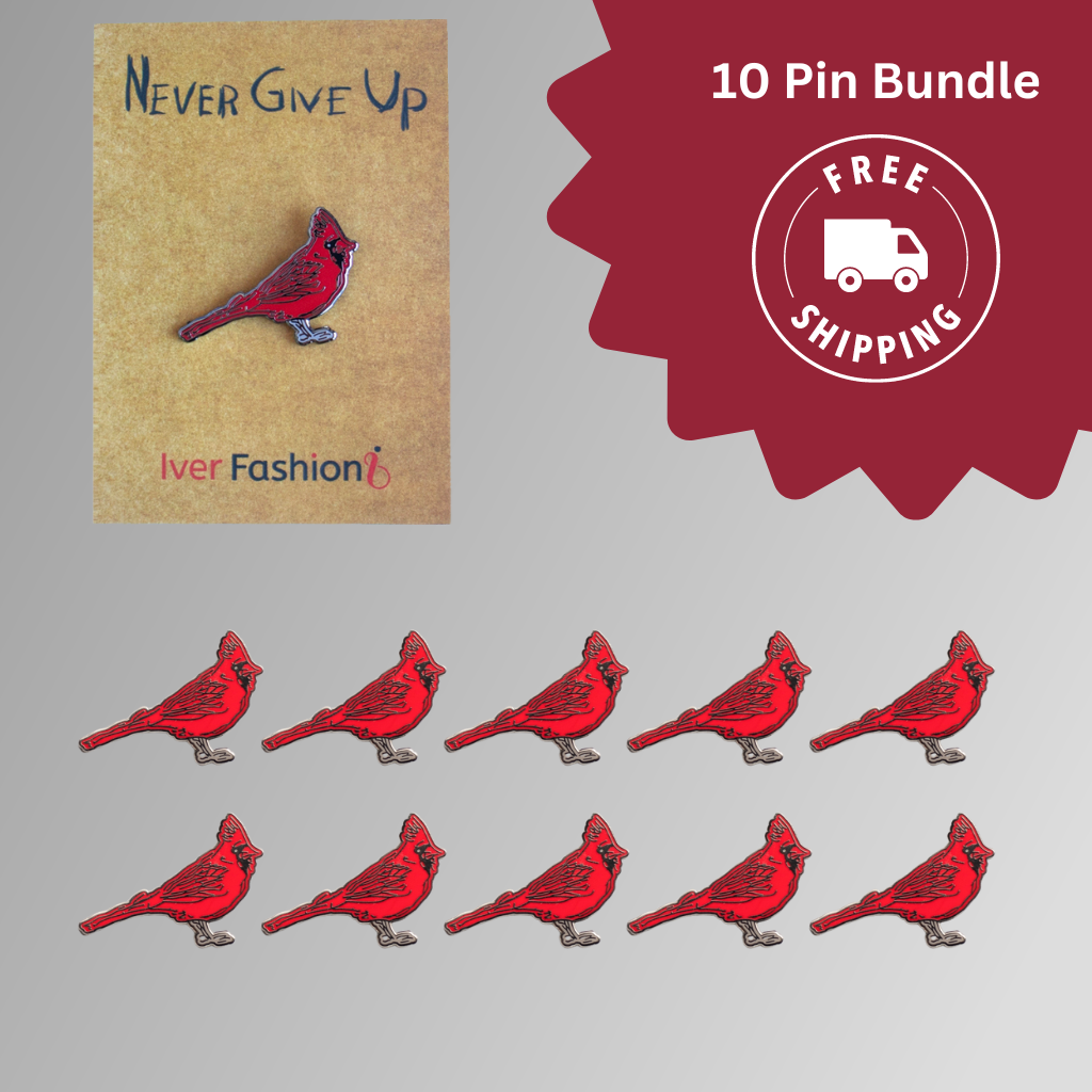 Bundle and Save: Buy a bundle of 10 Red Cardinal 'Never Give Up' pins and save on shipping costs. It's the perfect way to share the message of hope with friends, family, and colleagues.